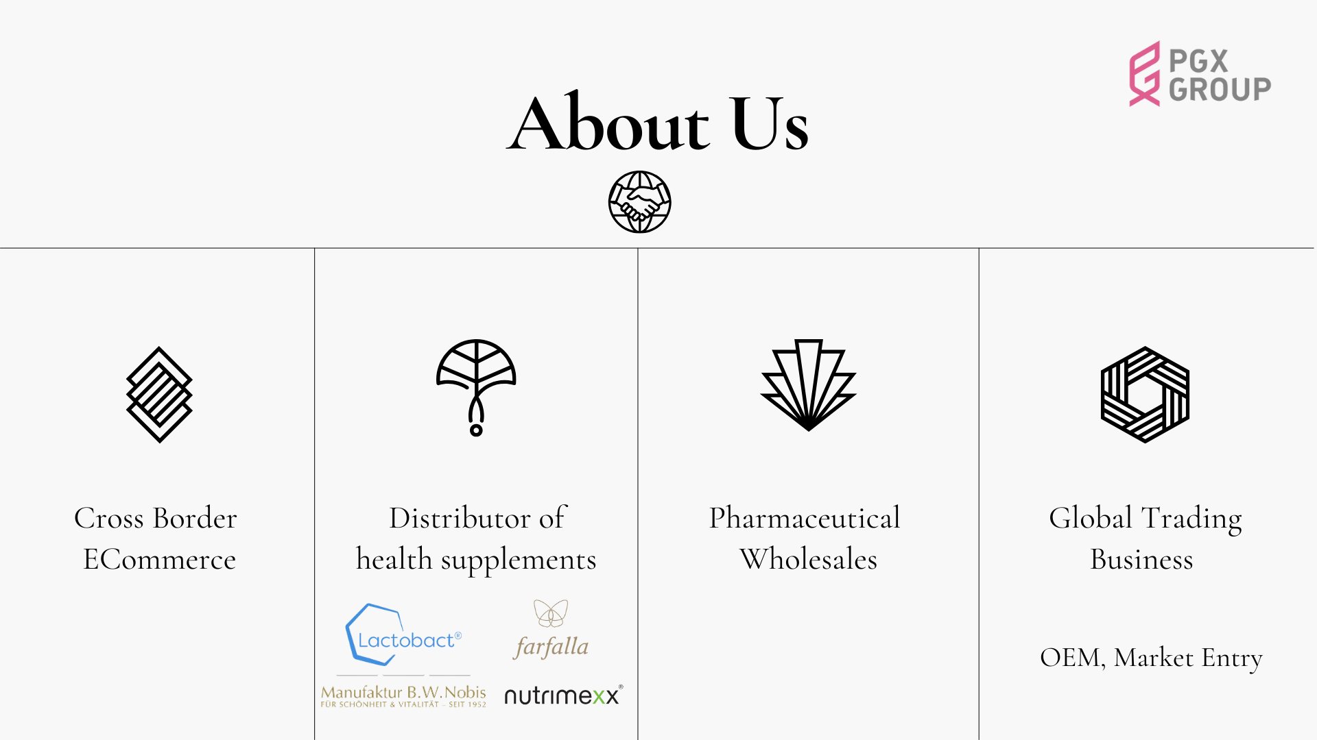 PGX GROUP is a leading cross-border e-commerce and global trading company, specializing in distributing premium health supplements, pharmaceuticals, and market entry solutions. With a strong connection between Germany and Taiwan, we help brands expand their reach and navigate international markets.